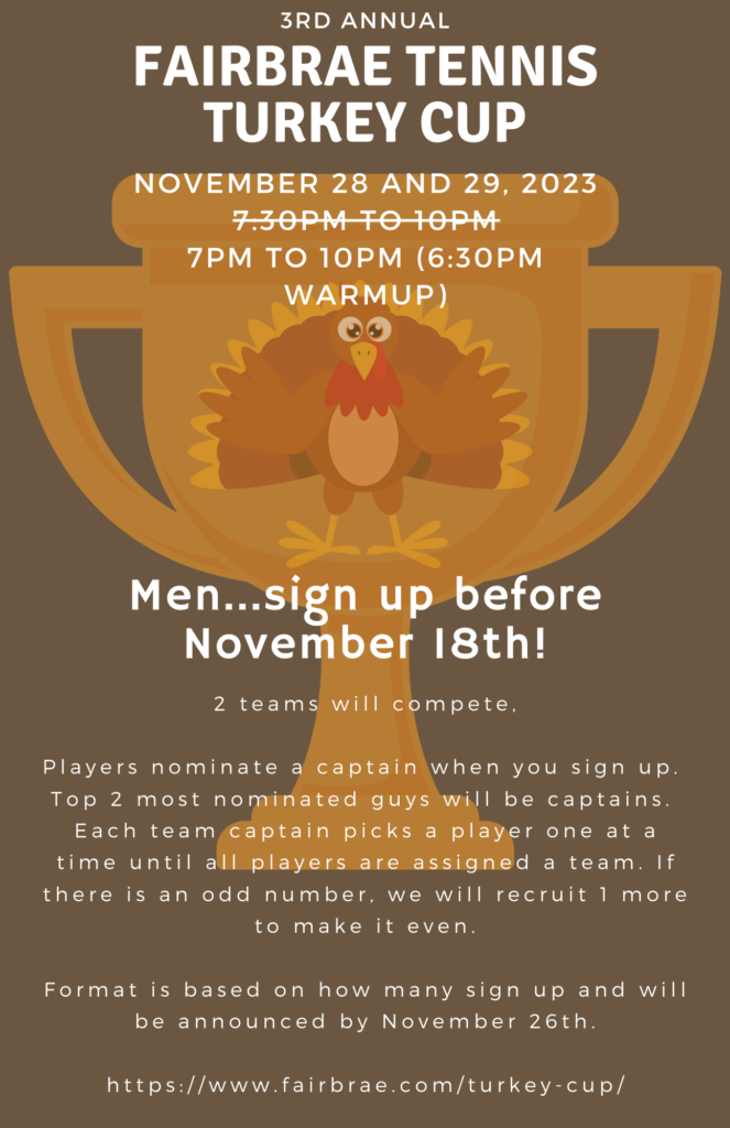 The Turkey Cup is an annual men’s tennis tradition at Fairbrae since 2021. Click here to sign up: Turkey Cup Sign-ups. Fairbrae members only. Gobble Gobble