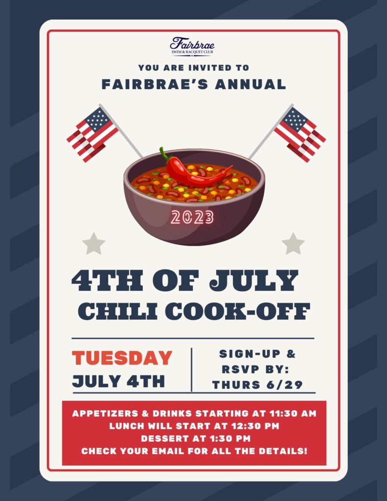 As a reminder, we will be serving appetizers and drinks starting at 11:30 AM! Chili tastings will start at 12:00 PM, with winners planned to be announced during dessert, starting at 1:30 PM. We are seeking contestants in this year’s cook-off, so please email anne@fairbrae.com or sign up via the RSVP link in your email if you are interested in participating. Not a fan of chili? No worries! We will have a baked potato bar for your enjoyment instead. Please consider volunteering to help with decorating or setup. See SignUp for all of the details. Hope to see you on the 4th of July at Fairbrae!