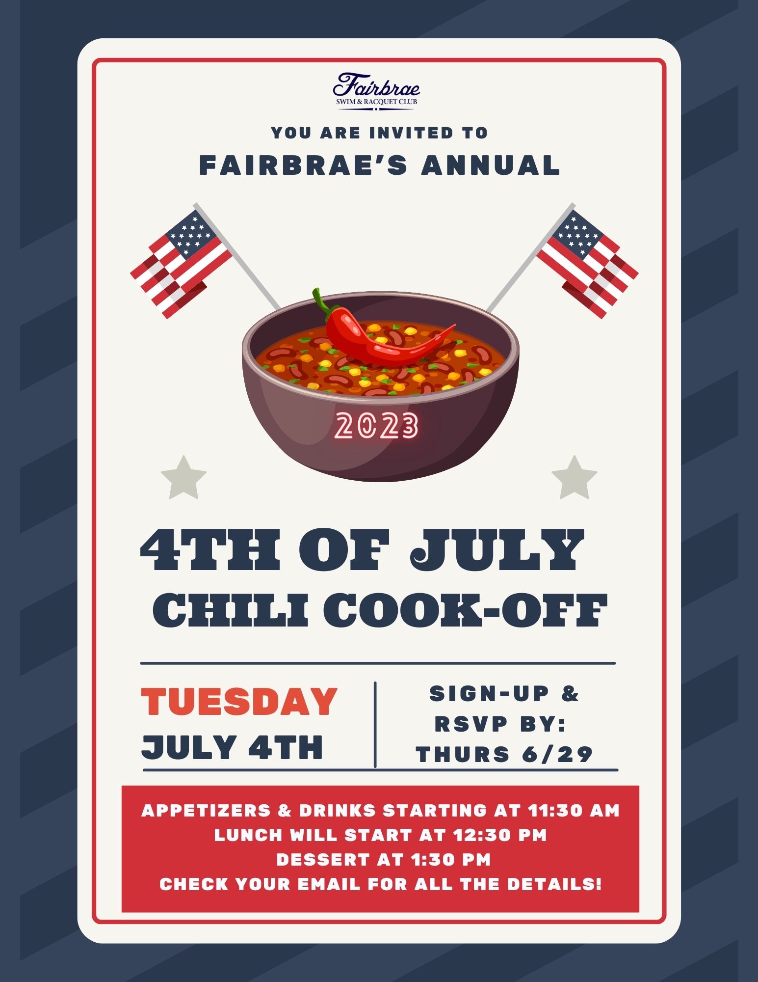 The Annual Chili Cook-off has arrived! Bring your best bowl to the clubhouse on July 4th and compete for bragging rights (and a small prize!). The rest of membership will serve as both TASTE TESTERS and JUDGES!