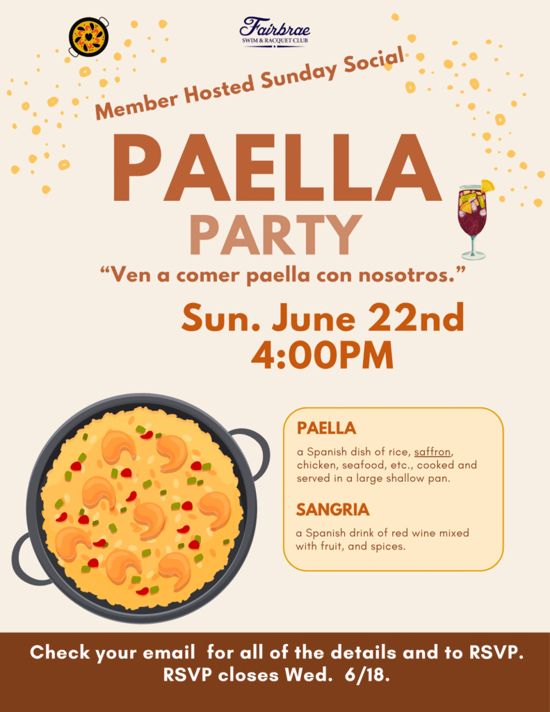 Come join us on June 22nd from 4-7pm when the Belvedere & Hayes families will host your Paella Party at the June Family Hosted Sunday Social. Bring those reusable plates, cups, and silverware, and get ready for some amazing food. Thanks to our hosts for helping out on this Sunday Social.