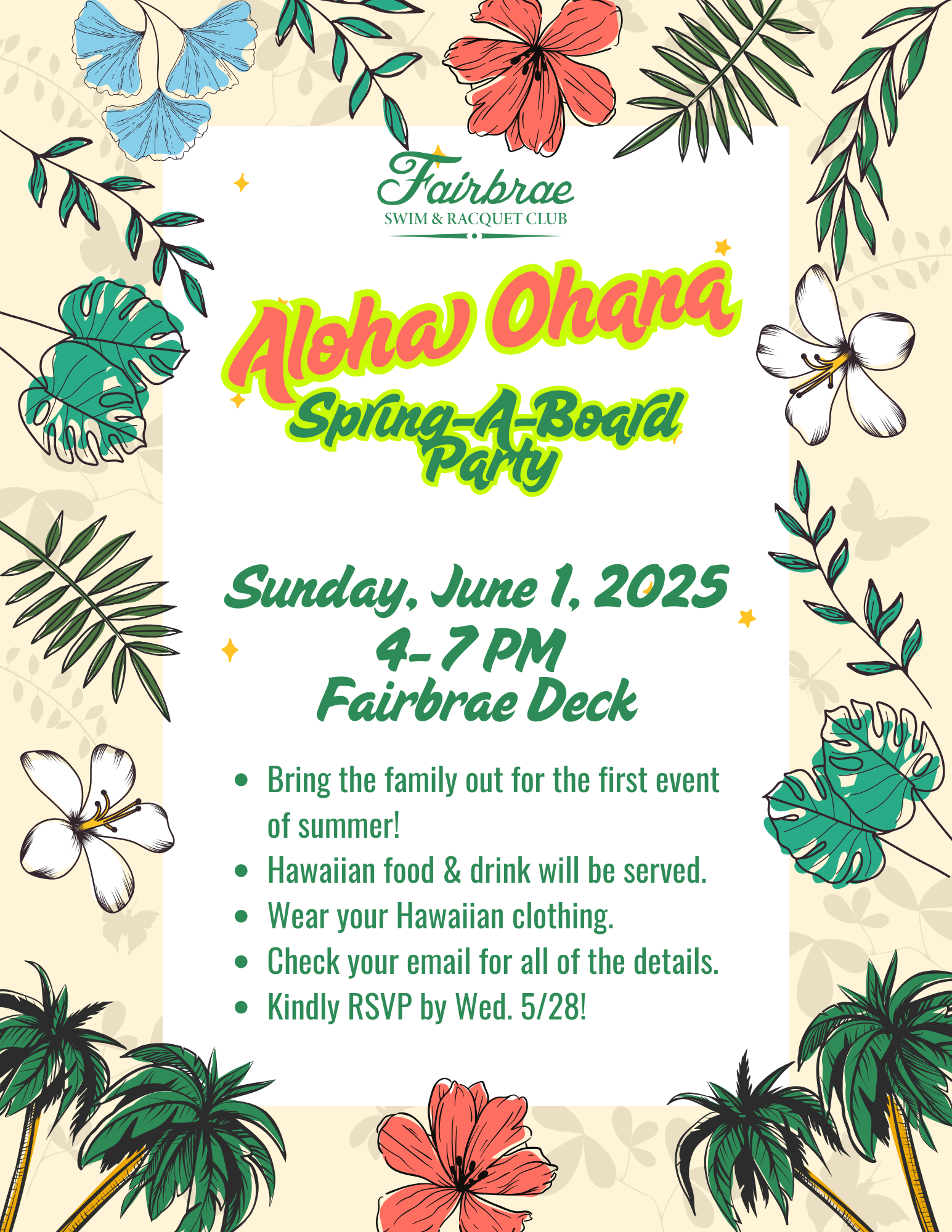 Check your email to RSVP for the 2025 “Aloha Ohana” Spring-A-Board Party. This event signals the start of the busy season at Fairbrae and this year we are kicking it off on Sunday, June 1st from 4:00 – 7:00 PM! The club will provide the food, drinks, and activities for all ages to enjoy!