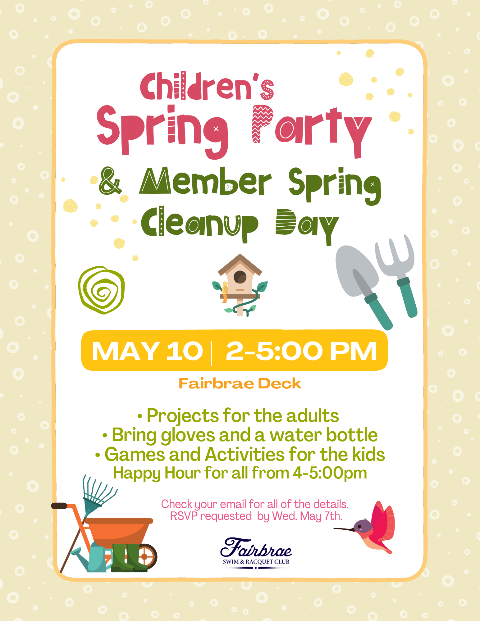 Every year in May, we gather the members together to get the club ready for the spring and summer months by helping clean up the space. As 1/300 owner of the club, please consider volunteering on Saturday, May 10th to make YOUR club shine! Work for an hour or all morning, its up to you. This is a great opportunity for new members to meet other members. Families are welcome to come work together or YOUNGER KIDS CAN GO TO SPRING PARTY AT SAME TIME. We will use the day to dust, pressure wash, weed, clean, organize and so much more. Come make Fairbrae ready for the warm weather fun ahead of us! Bring gloves and a water bottle. We will celebrate our work once it is done by having some delicious Happy Hour snacks and drinks. We will get you home in time for your dinner and a night on the town.