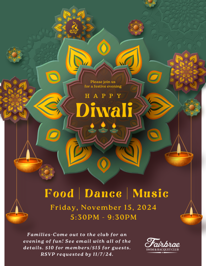 Come celebrate Diwali with your Fairbrae family on Friday, November 15th from 5:30-9:30pm.