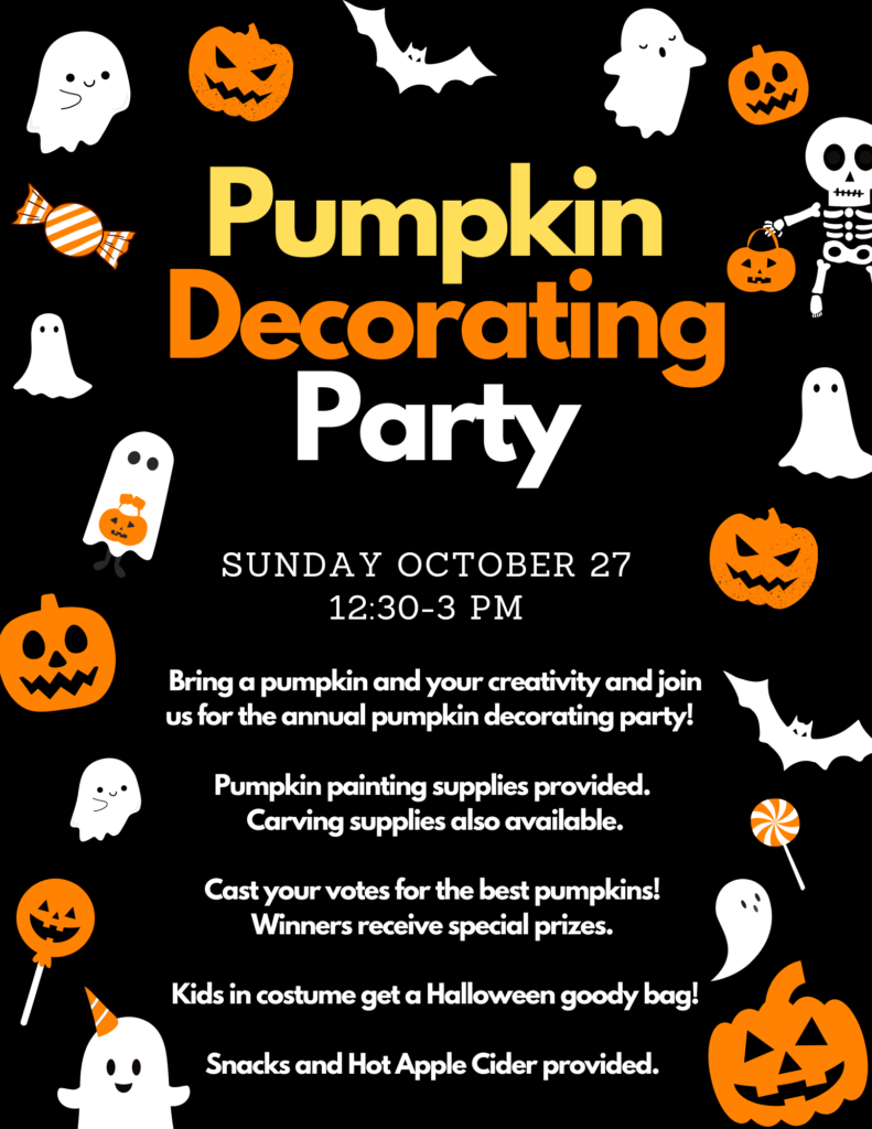 Families- come join us anytime from 12:30-3:00pm for a fun afternoon of decorating your pumpkin (brought from your home) with your family and friends at Fairbrae. Refreshments, paint, and carving tools will be provided. Prizes will be given out at 2:30 pm to the scariest, funniest, most creative, and overall favorite pumpkins. The plan is to have it on the outside deck (weather permitting), otherwise it will be inside the clubhouse.