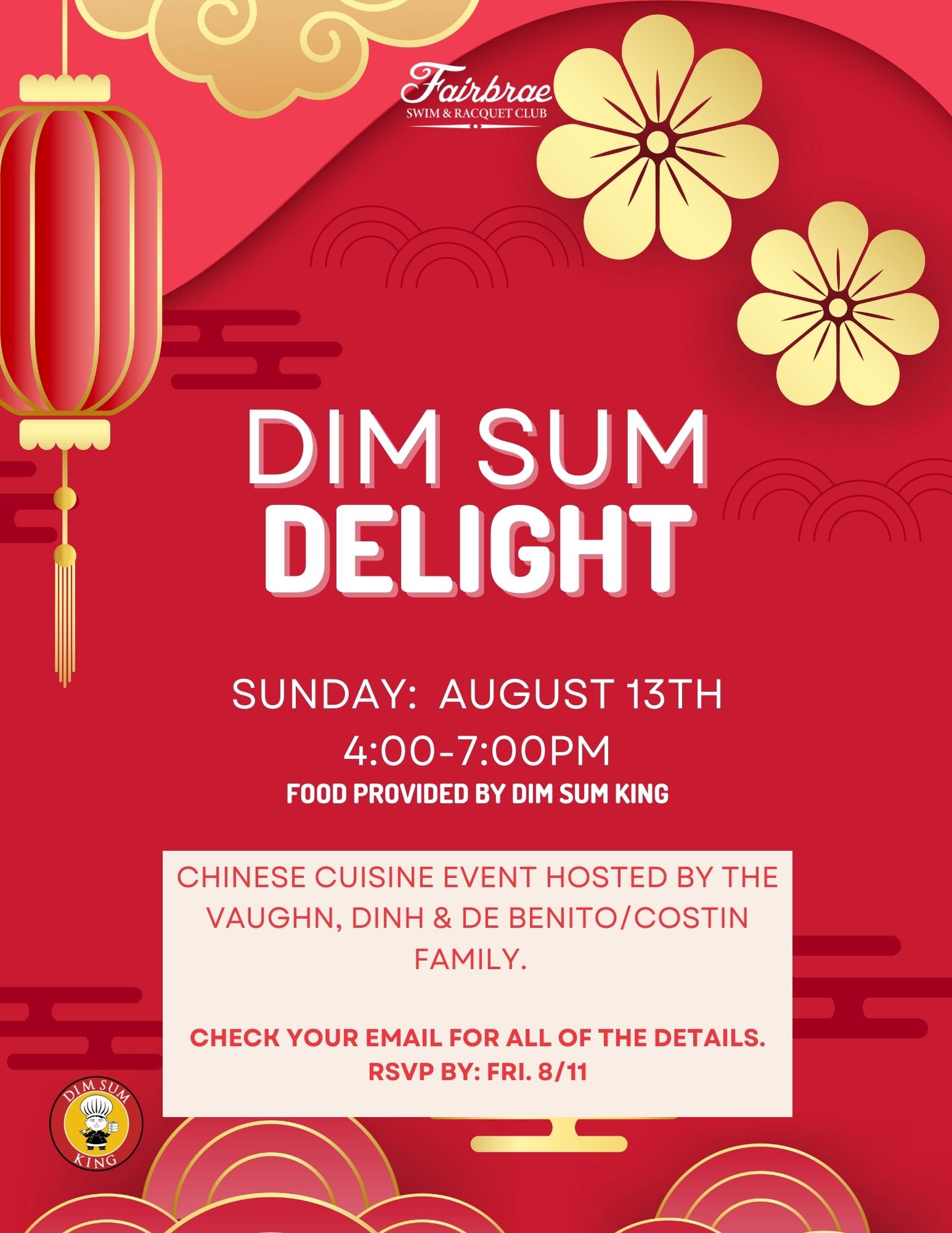 “Dim Sum” simply means “To Touch the Heart”. Similar to French Hors d’oeuvres and Spanish tapas, Dim Sum is a Chinese small bite. It is traditionally eaten for breakfast and lunch at tea houses, where families gather on weekends to catch up with each other and feast over an endless array of flavors and delicacies. Instead of hosting for breakfast/lunch the event will take place at 4pm. Thank you Vaughn and De Benito/Costin families for hosting the event! Hope you can join us.