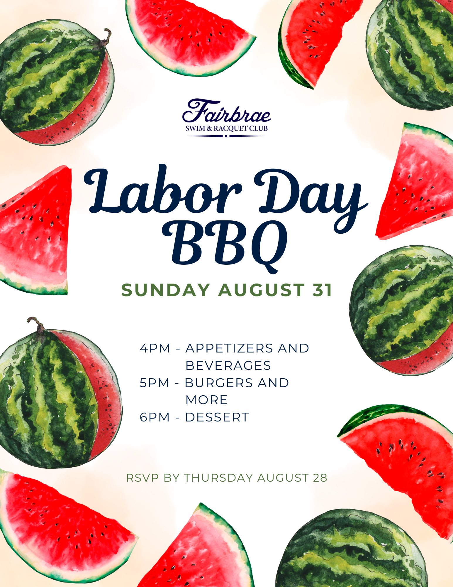 Because we want to ensure we have enough food provided for all members & guests at the Labor Day Party, we would kindly ask you to RSVP by: Thursday, Aug. 28th. See your email for the RSVP link.