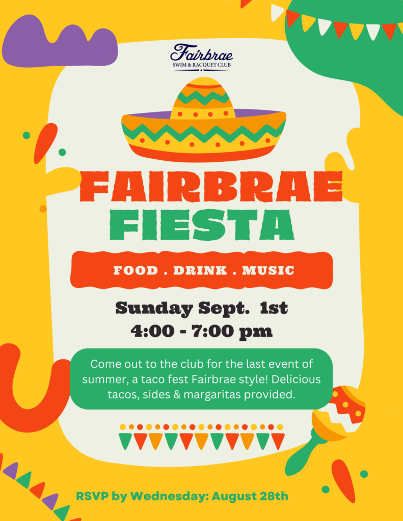 22 Aug 2024 Fairbrae Fiesta- September 1st by Anne Branch (Staff) | posted in: Events | 0 Can you believe summer is coming to a close? We will be hosting our final summer event on Sunday, September 1st starting at 4:00pm. Come out to the fiesta for some delicious tacos and margaritas and soo much more. RSVP by Wed. 8/28. See you soon!