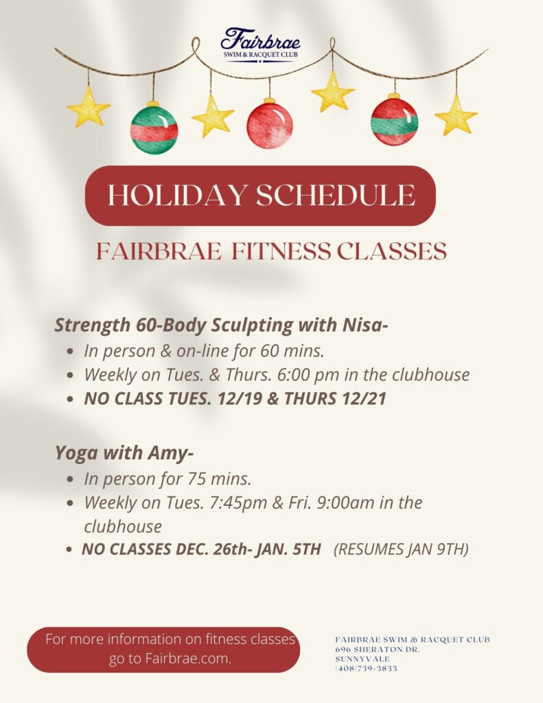 13 Dec 2023 Fairbrae Fitness Classes- Holiday Schedule by Anne Branch (Staff) | posted in: Events | 0 See flyer below with 2023 holiday schedule.
