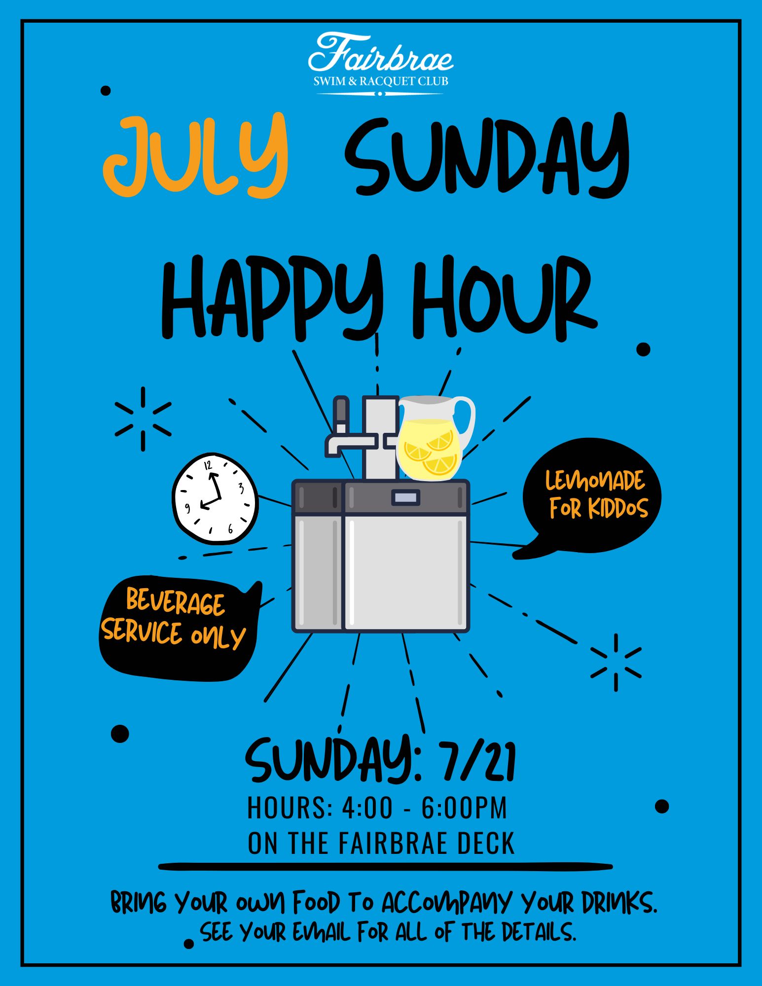 Beverage Service only from 4-6pm! Bring your own food to accompany your drinks. Gas BBQ’s are ready!