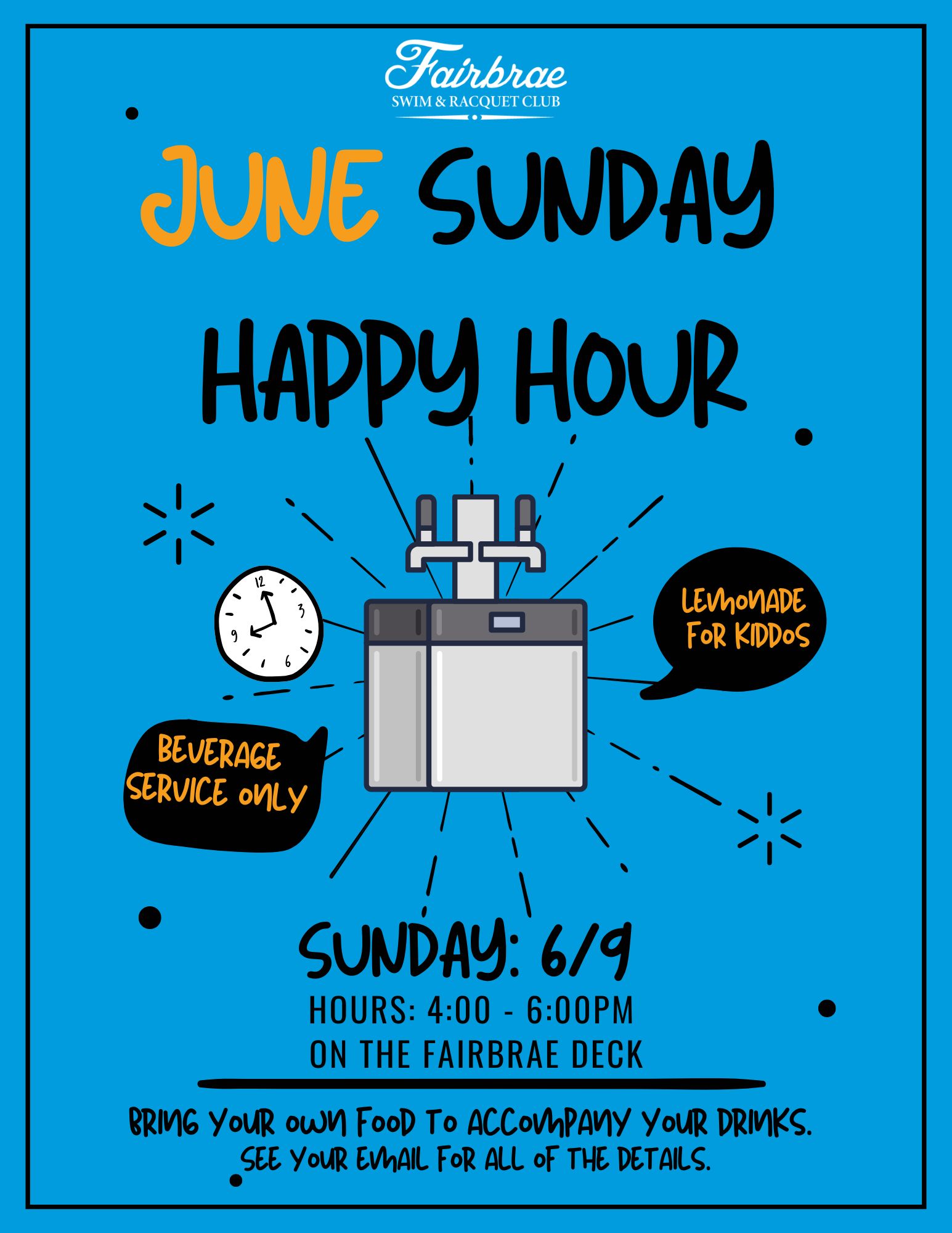 Beverage Service only from 4-6pm! Bring your own food to accompany your drinks. Gas BBQ’s are ready!