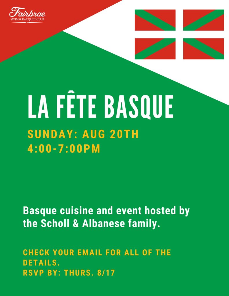 7 Aug 2023 La Fete Basque Sunday Social- Sun. 8/20 by Anne Branch (Staff) | posted in: Events | 0 Come join your Fairbrae family for some delicious: Basque Chicken (Poulet Basquaise), rice, salad and dessert. Thank you Scholl and Albanese families for hosting our event. RSVP by: Thurs. Aug 17th.