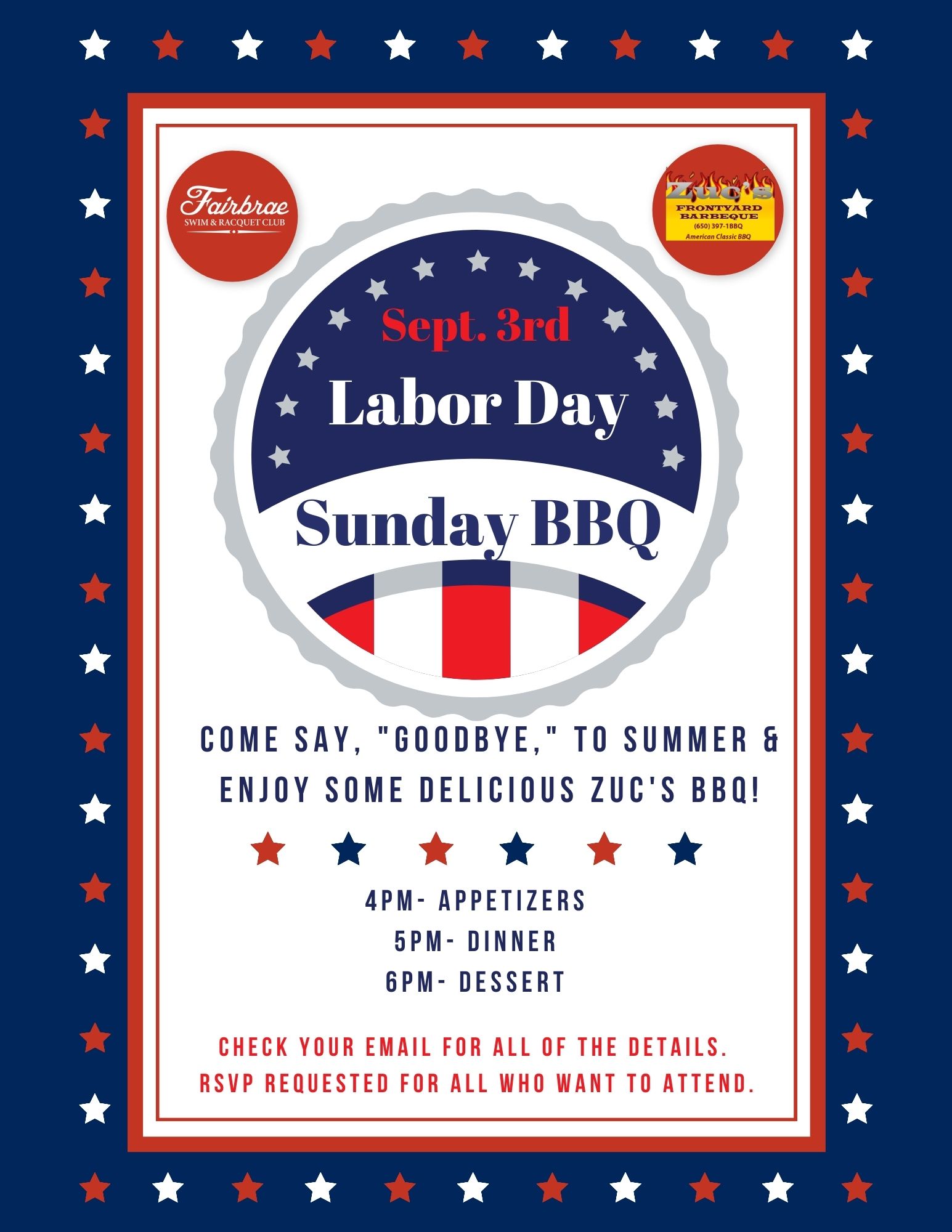 Appetizers will start at 4:00 pm with the BBQ to follow at 5:00 pm. BBQ hosted by Zuc’s Frontyard BBQ! Dessert will be provided once everyone has finished eating dinner, around 6:00 pm.