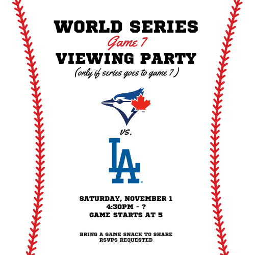 Is there anything more exciting than an MLB game 7? Join us for a WORLD SERIES watch party on Saturday, November 1 at 4:30pm. Bring a game snack to share and get ready for an exciting game of baseball.