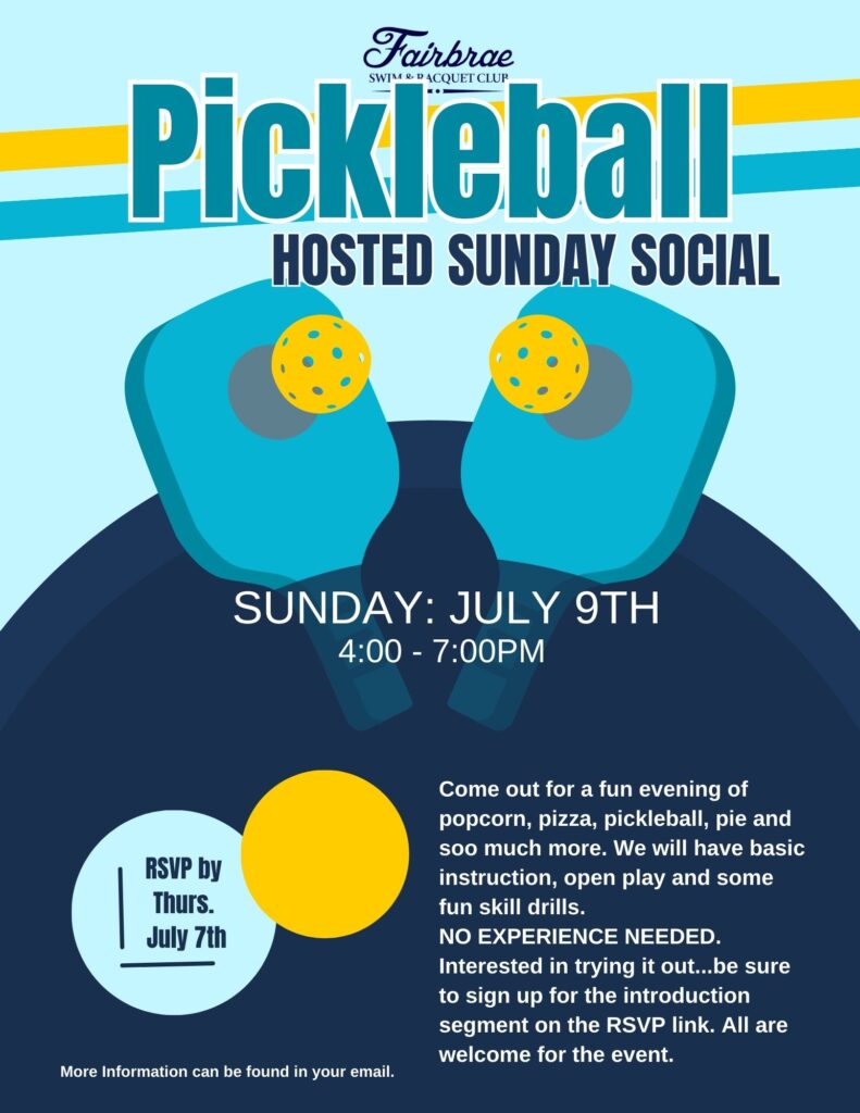 Have you ever wondered how to play this game called, “Pickleball?” Why do they call it pickleball and when did it get started? All of these questions will be answered at the Pickleball Group Hosted Sunday Social on Sunday, July 9th starting at 4PM. Come out and join us for the fun!