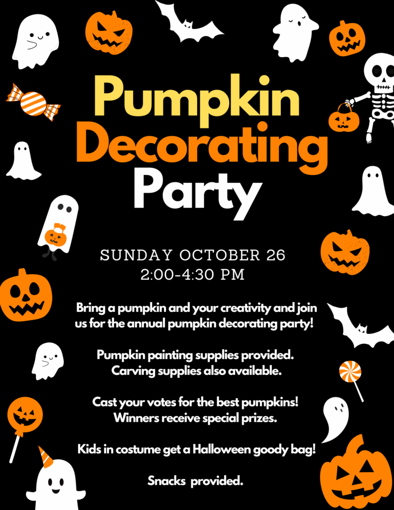 Bring a pumpkin and your creativity and join us for the annual pumpkin decorating party!  Pumpkin painting and carving supplies will be provided.  Kids of all ages are encouraged to attend.