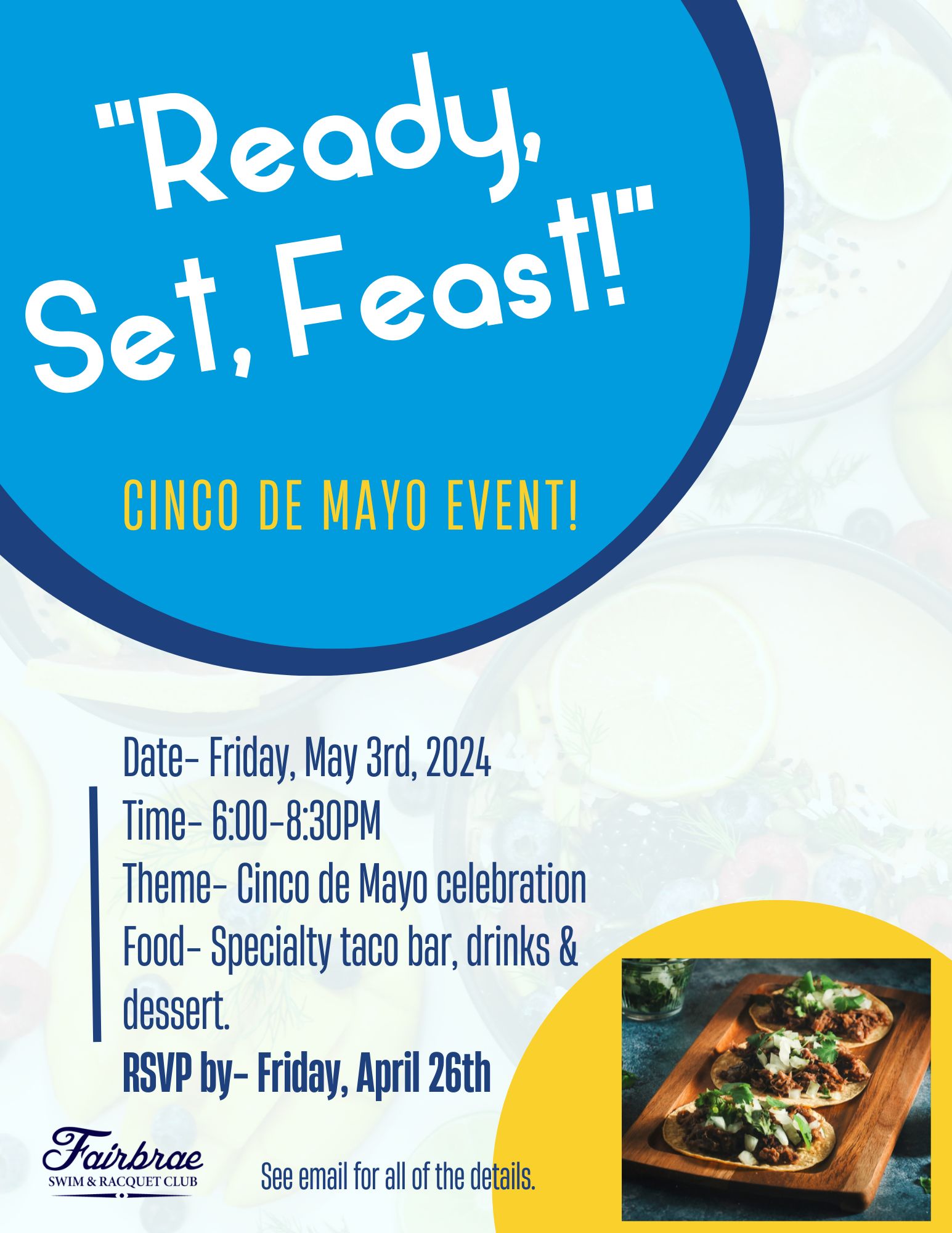 You are invited to the “Ready, Set, Feast!” Cinco de Mayo Event. Come out on Friday 5/3 at 6:00pm and enjoy an evening of Mexican food and music. We will have a speciality taco bar, drinks and dessert. This is AN ADULTS ONLY event. If you have small kiddos at home, grab a babysitter and come out for the fun. This event was previously called the “Wine and Dine” Series.