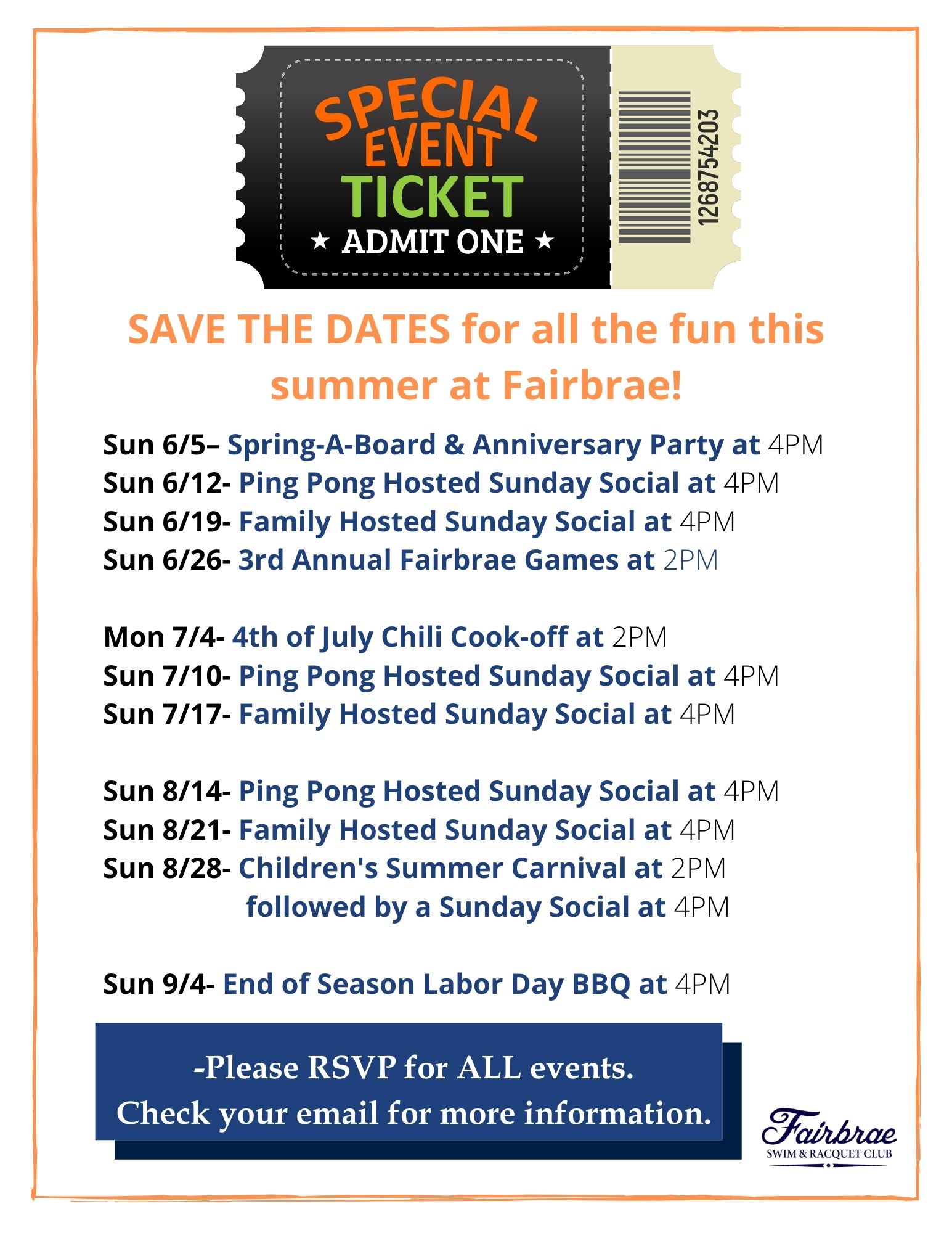 Please note which Sundays in the summer months have events and RSVP in advance to allow for an accurate amount of food and drinks to be purchased. Be sure to read the reminder below about our new RSVP program called SignUp.com. Sign-ups for each event will open approximately 3-4 weeks prior to the event.