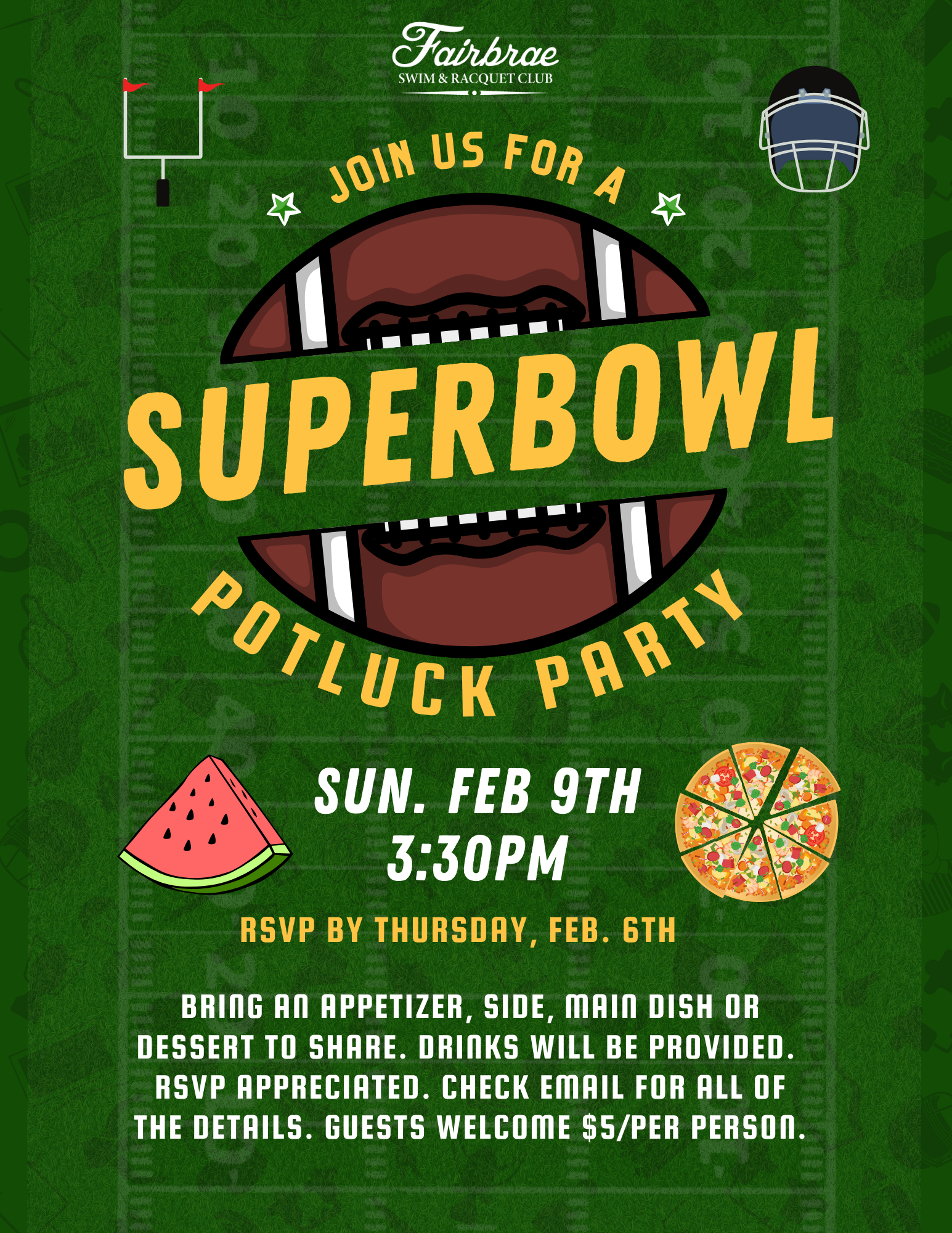 Bring the whole family out at 3:30pm on Sunday, Feb. 9th to celebrate the Superbowl LIX with some delicious food and Fairbrae friendship. New members be sure to sign up, this is a great opportunity to get to know your new Fairbrae family.